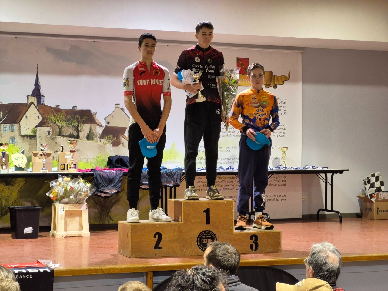 En 11/12 ans Malo Gazonnaud termine 7ème; Noah en 15/16 ans 3ème; en 3ème cat Christophe Mirablon 16ème, Alex 27ème; en 4ème cat David 4ème, Daniél 7ème Michel 11ème mais non classé car en VTT !!