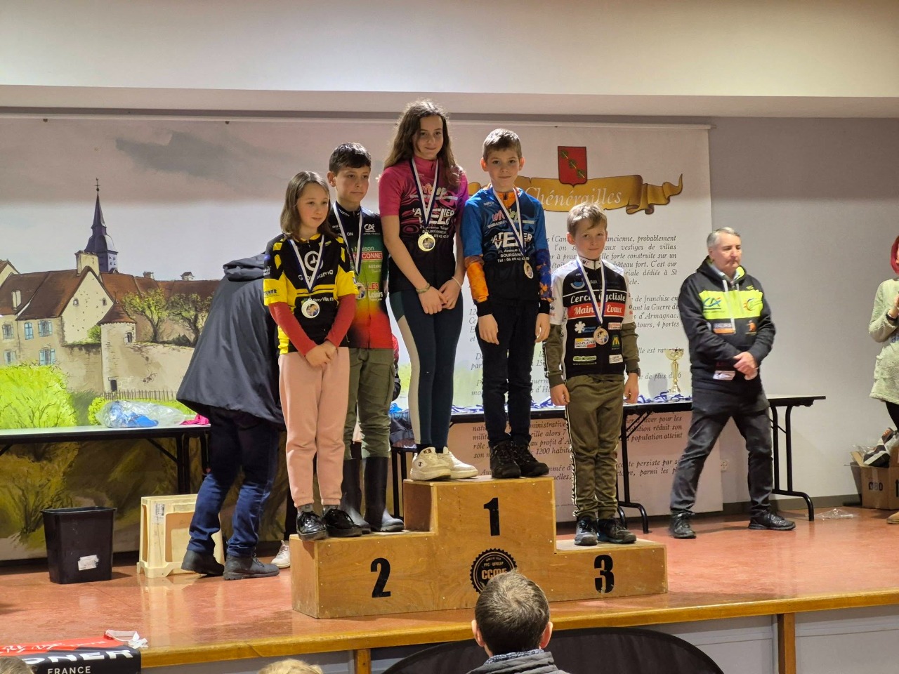 Malo (11/12) 3ème, Noah(15/16) 4ème,Alex 19ème, David 6ème, Daniel 8ème, Michel (VTT) 10ème.